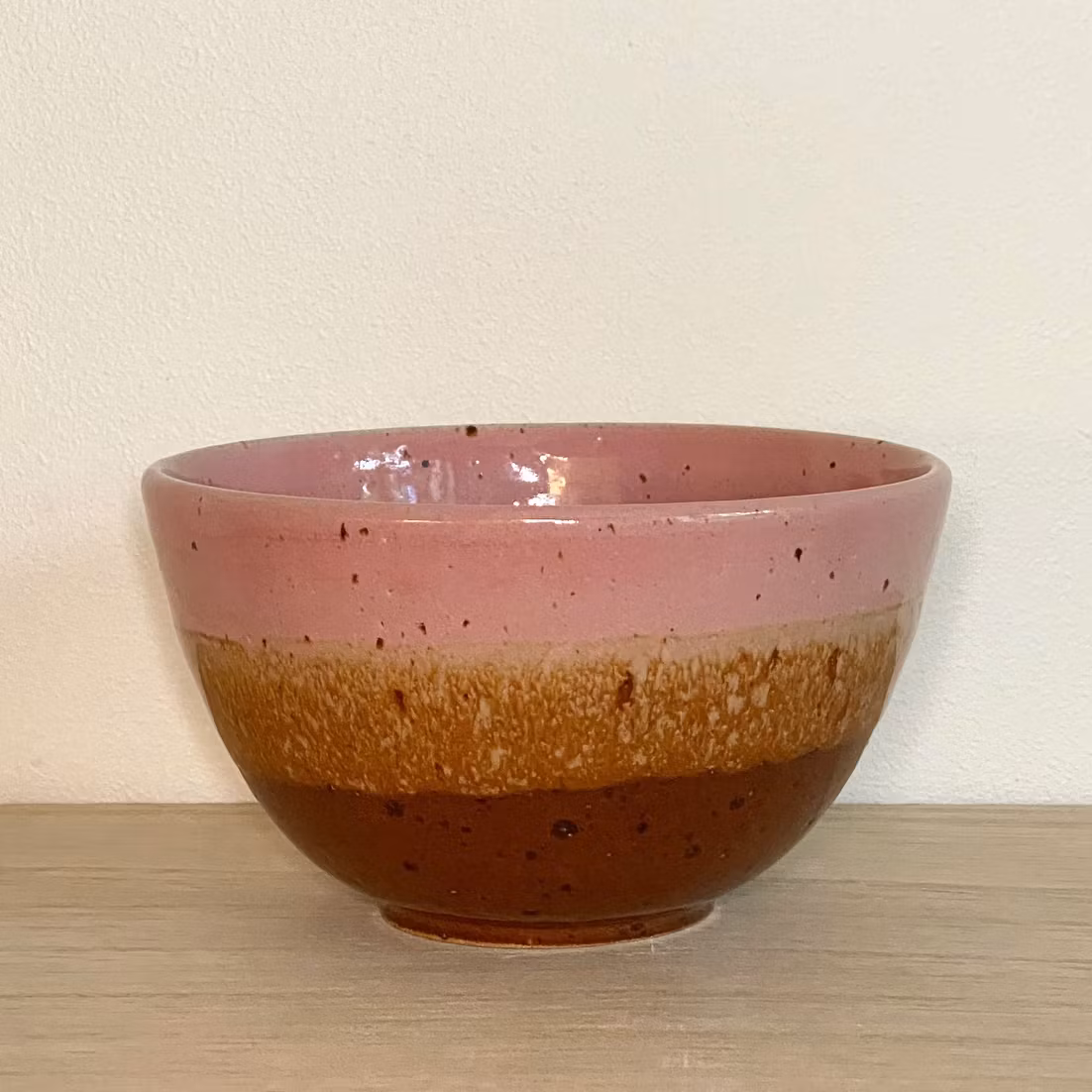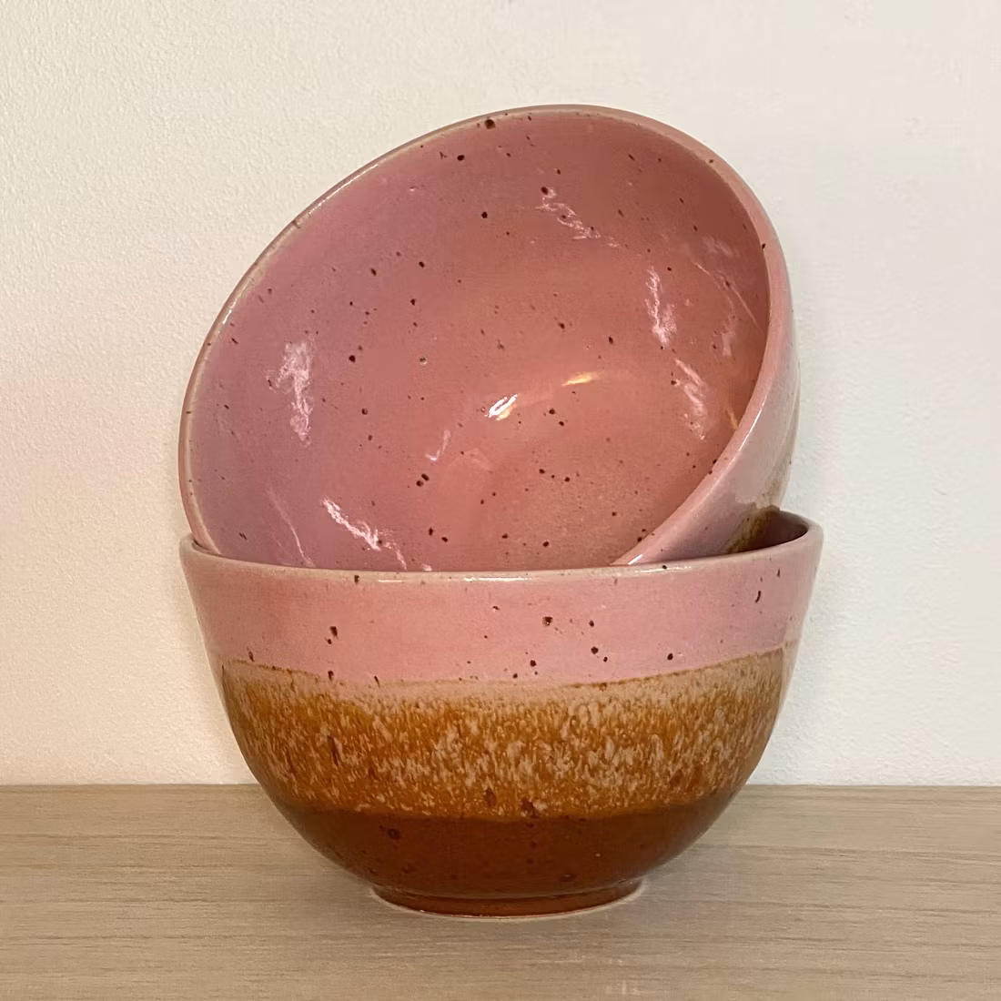 Skål på fot i prickig lera med rosa och roströd glasyr.