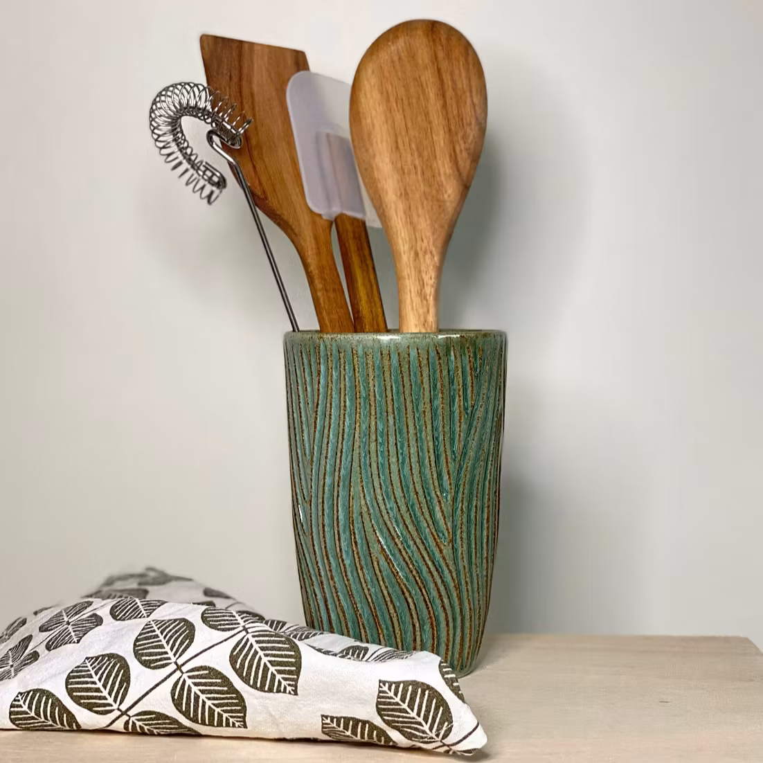 Vas i grå lavalera med karvat mönster och grön glasyr.