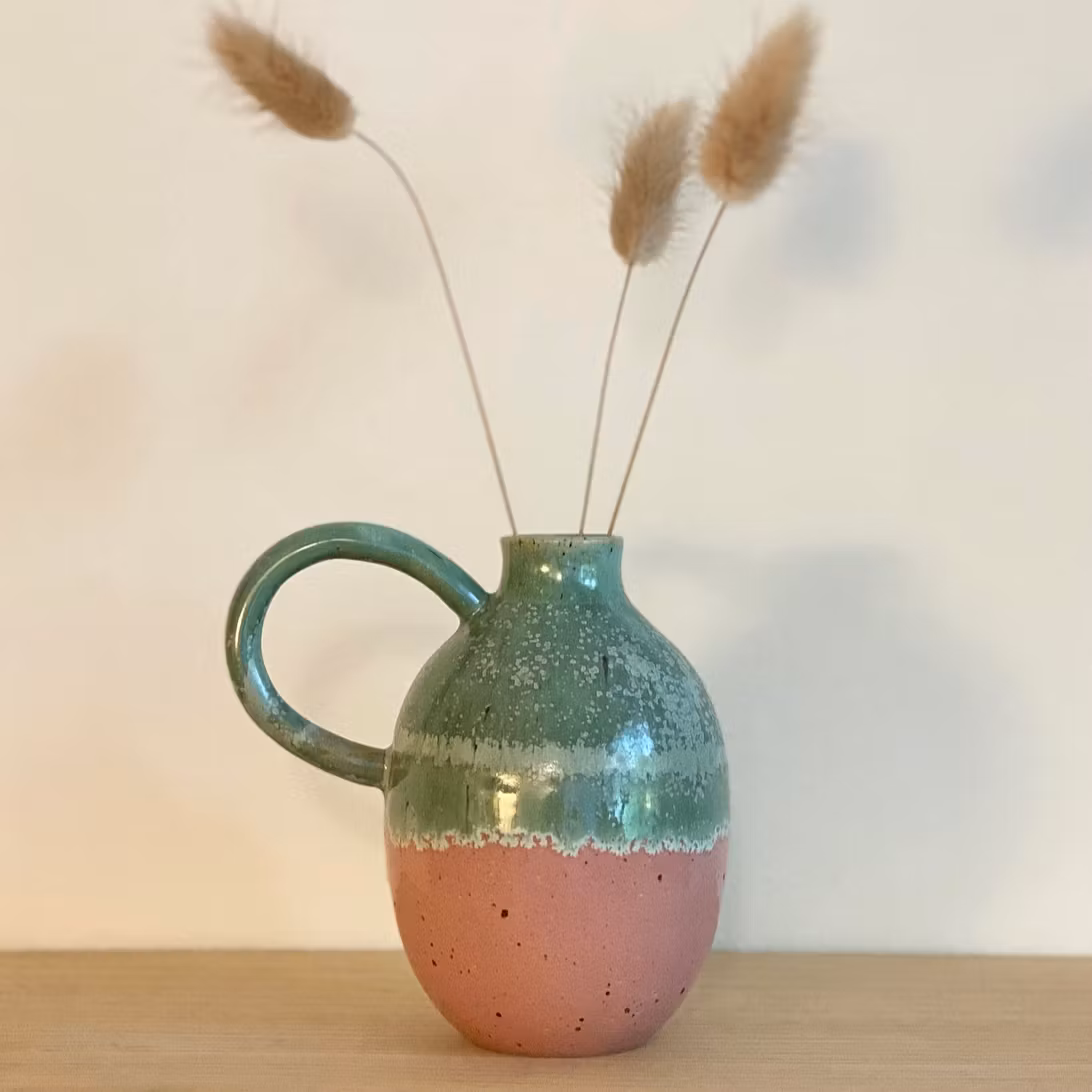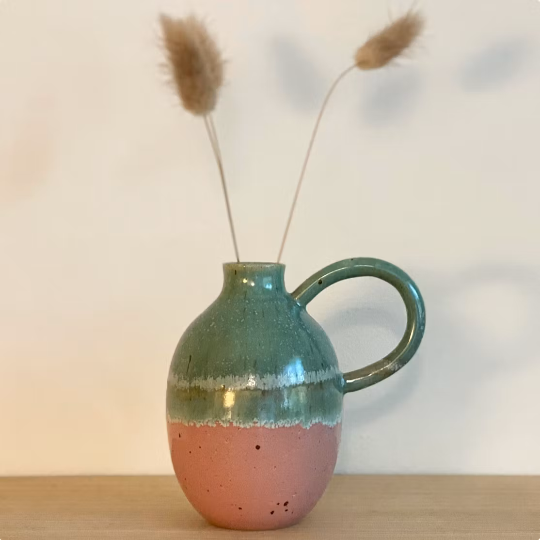 Mått: 7,5 cm som bredast, 12 cm hög (hänkel/öra ej inräknat).