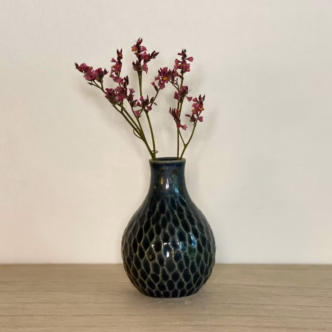 Vas i prickig lera med karvat mönster och djupblå glasyr.