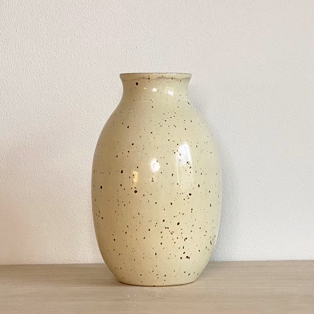Vas i prickig lera med glasyr i vanilj.